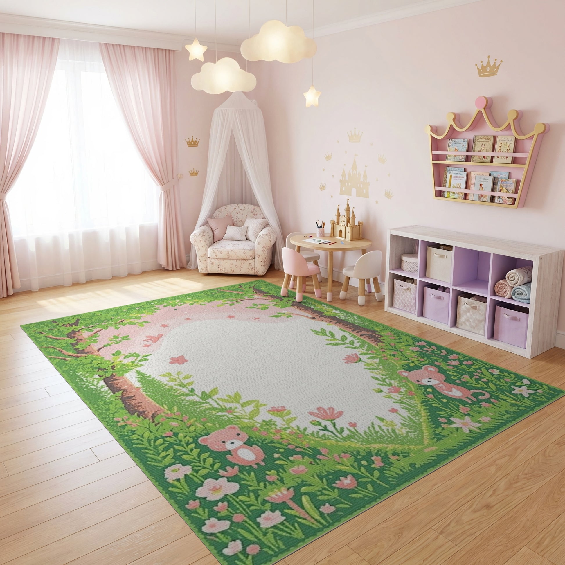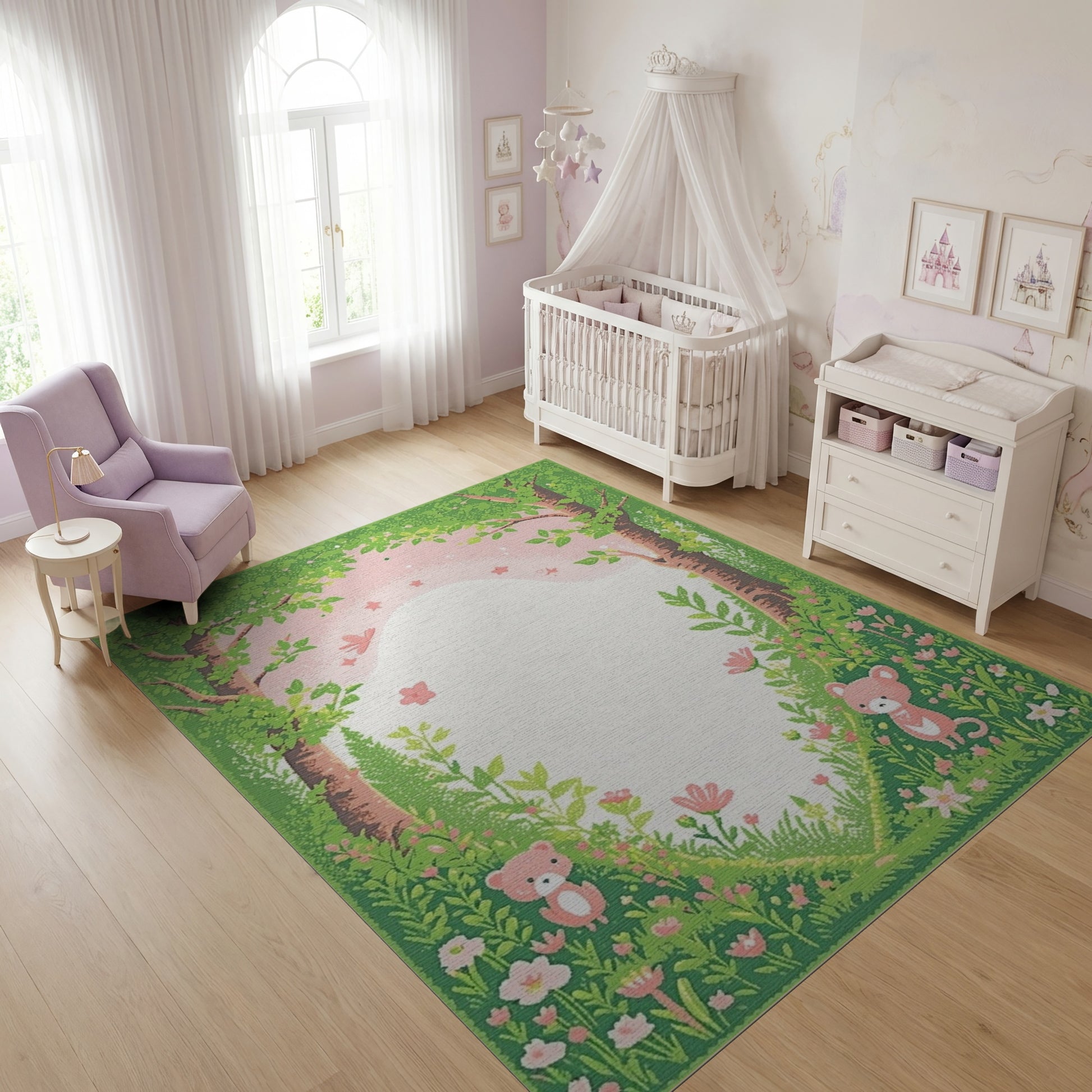 Flatwoven High Traffic Area Rug, Whimsical Forest Teddy Bears Floral Rug, Non Slip, Stain Resistant, Washable Area Rugs for Study Room, Playroom, Bedroom Overview: