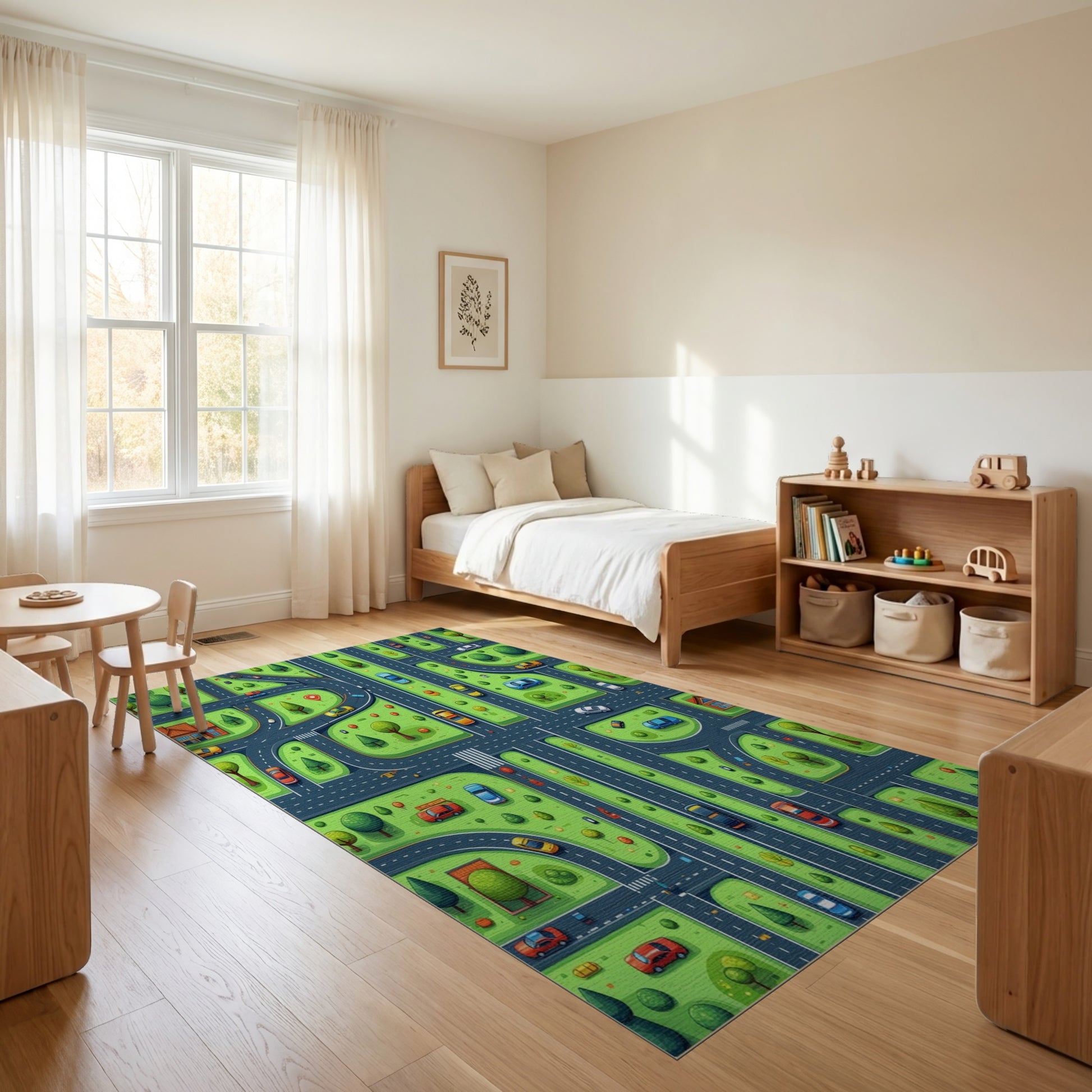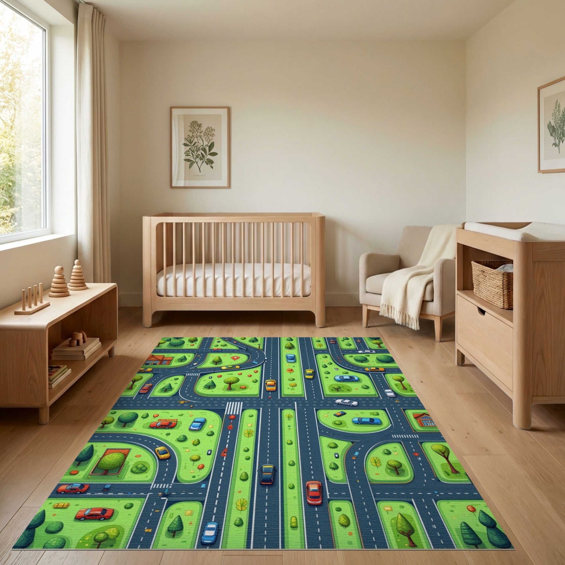 Flatwoven High Traffic Area Rug, Whimsical Green Streets Cars Trees Rug, Non Slip, Stain Resistant, Washable Area Rugs for Study Room, Playroom, Bedroom Overview: