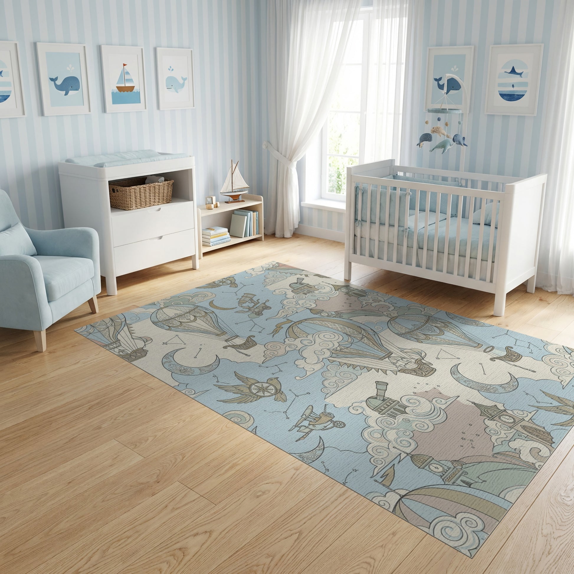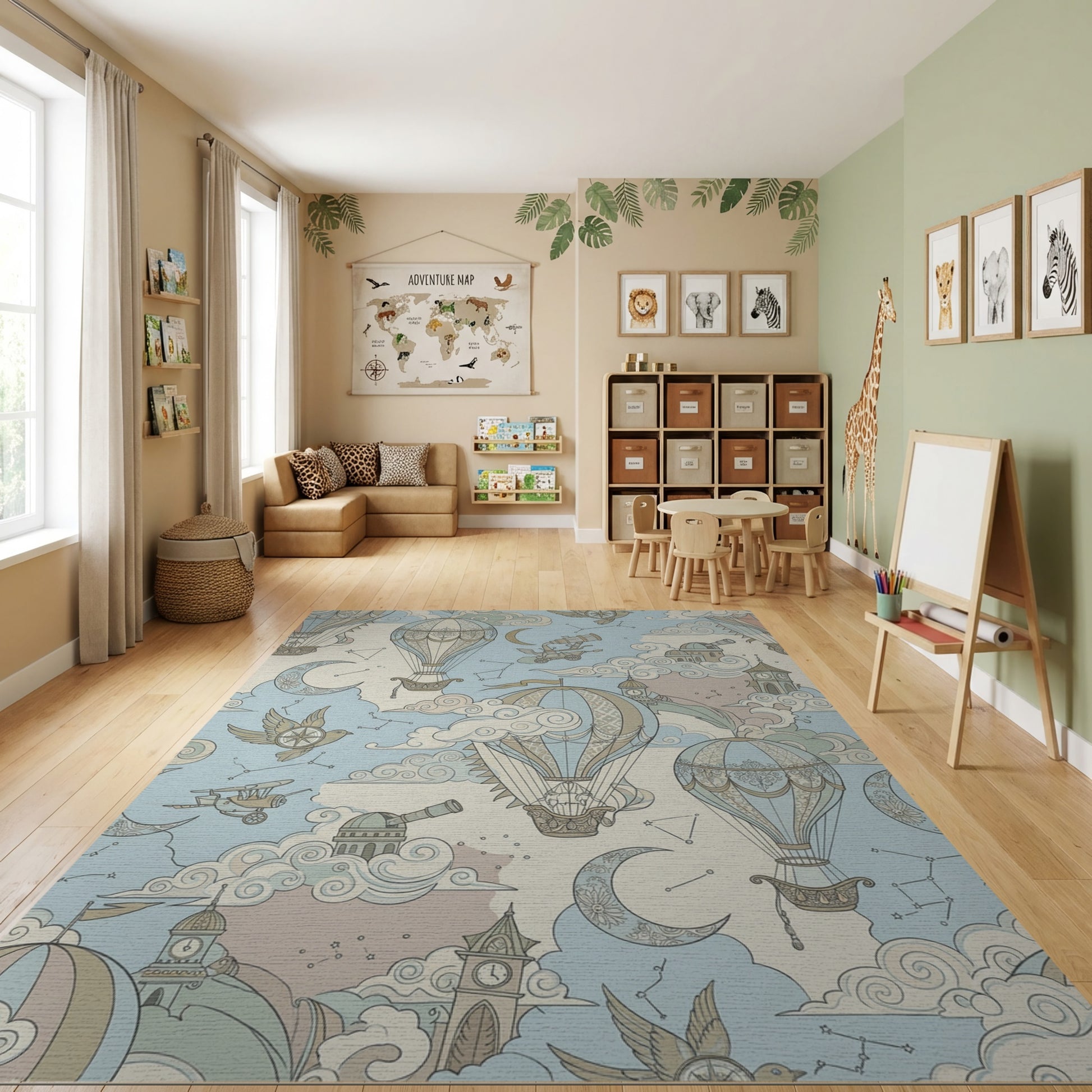 Flatwoven High Traffic Area Rug, Whimsical Hot Air Balloons Celestial Clouds Rug, Non Slip, Stain Resistant, Washable Area Rugs for Study Room, Playroom, Bedroom Overview:
