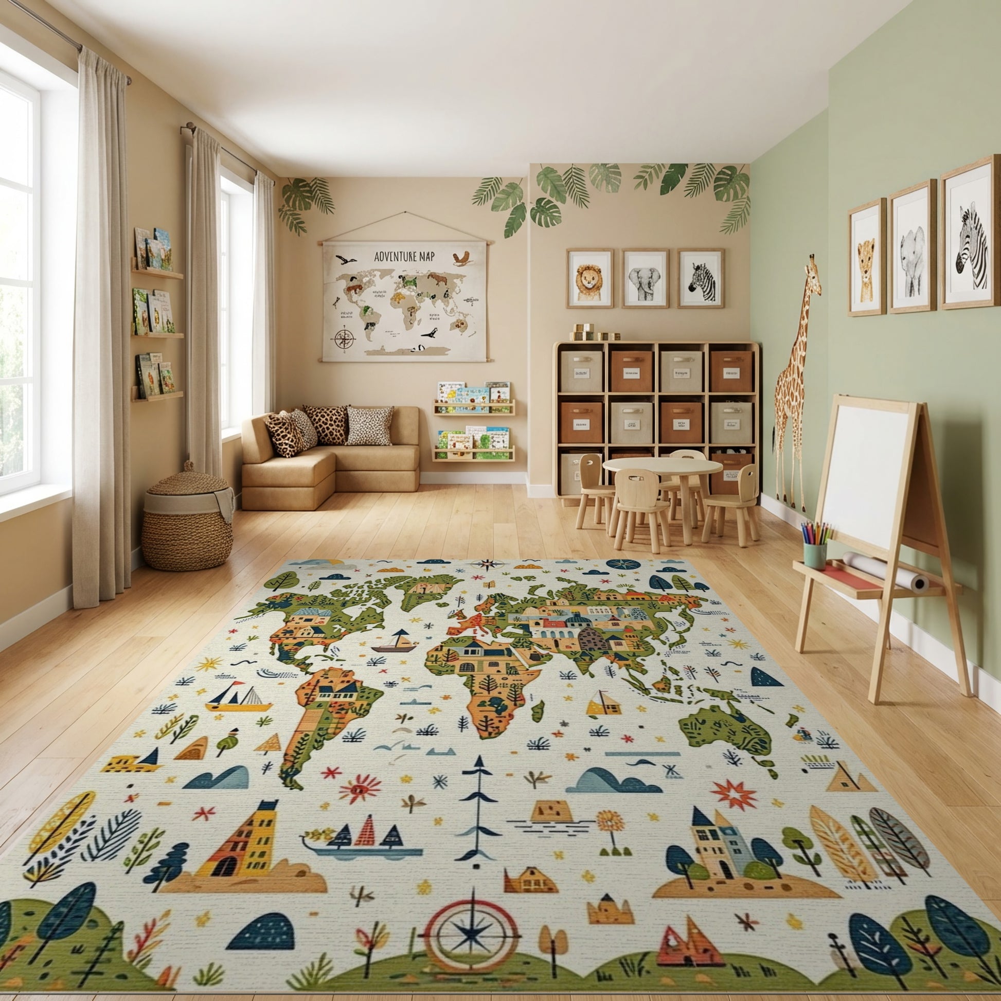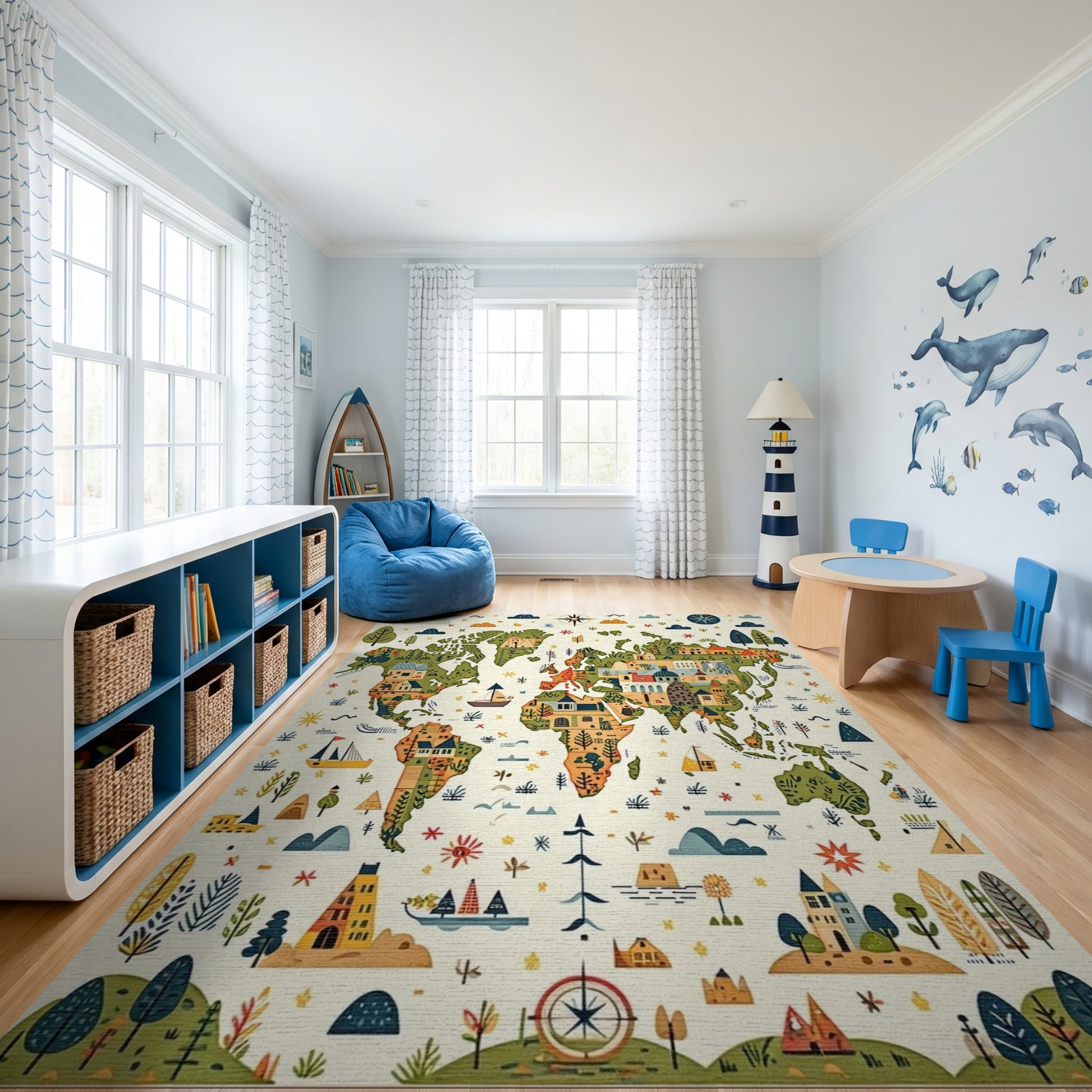 Flatwoven High Traffic Area Rug, Whimsical Illustrated World Map Rug, Non Slip, Stain Resistant, Washable Area Rugs for Study Room, Playroom, Bedroom Overview: