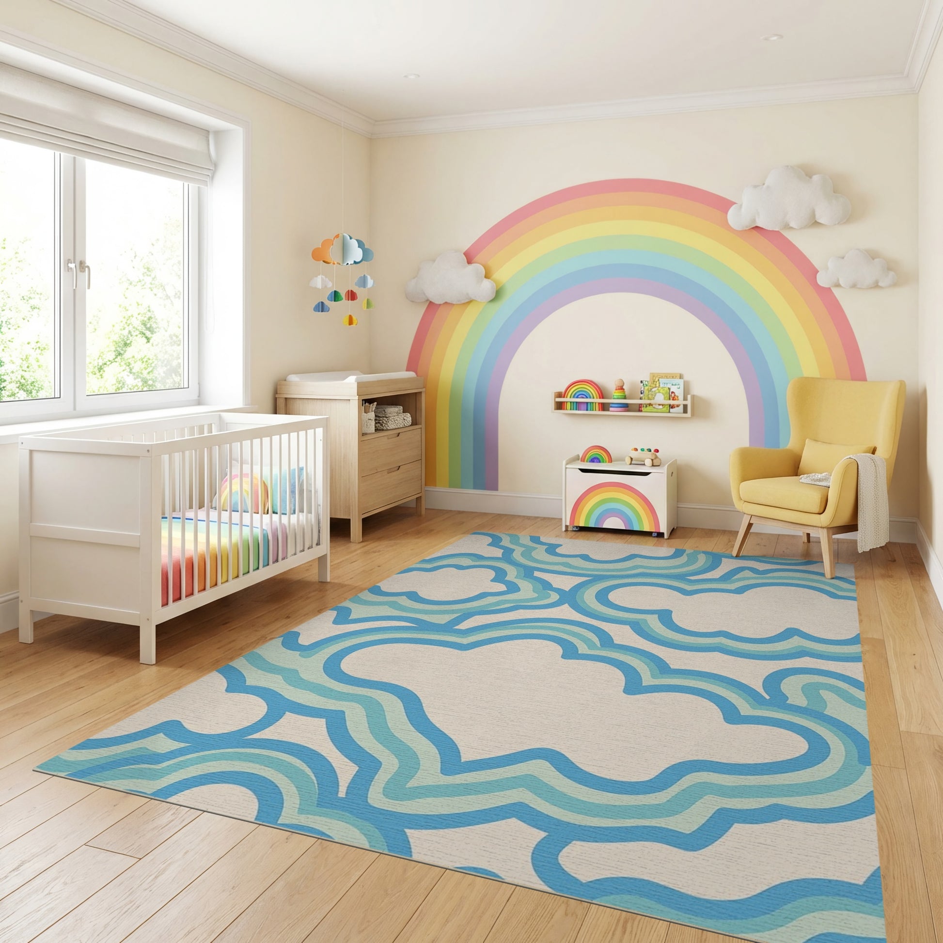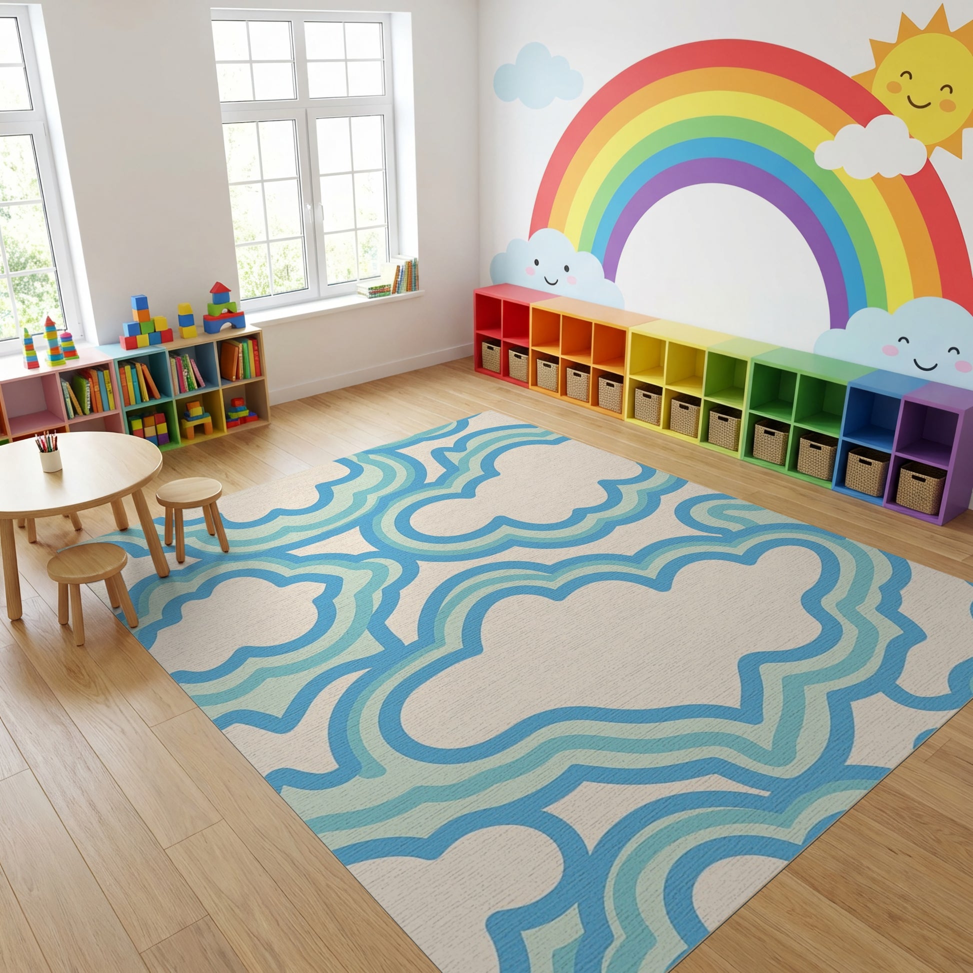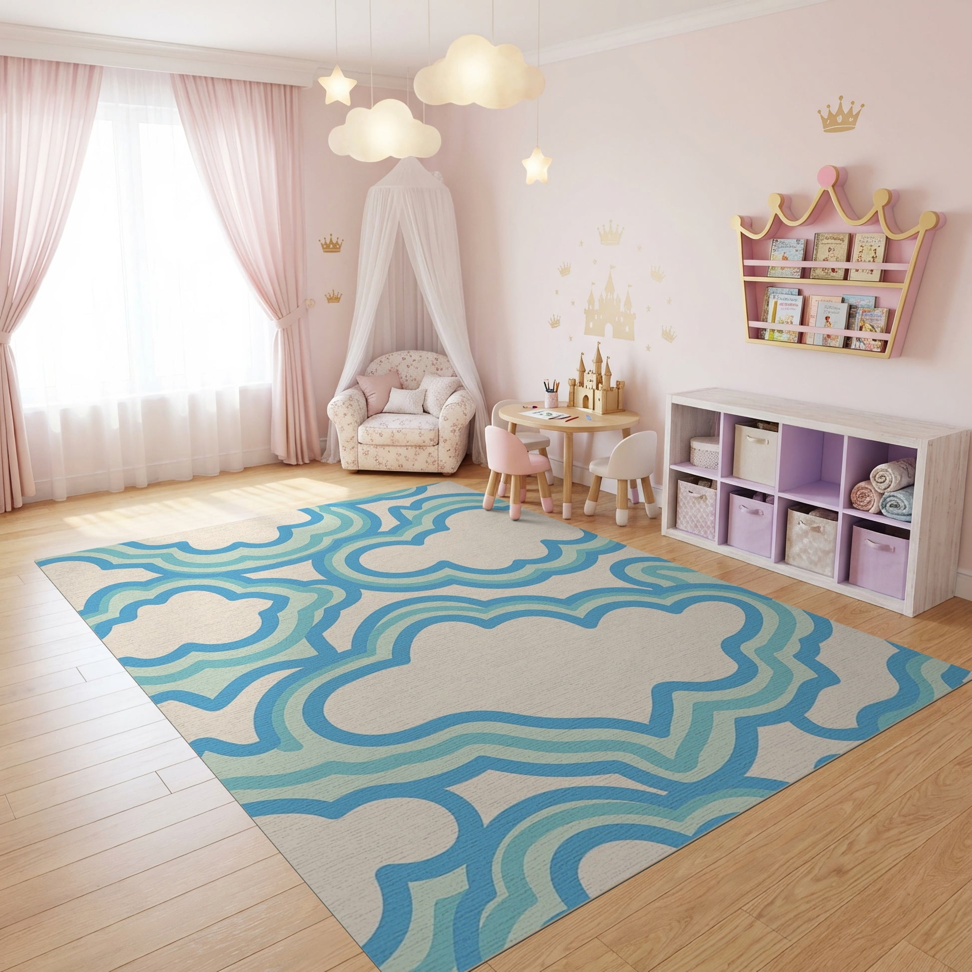 Flatwoven High Traffic Area Rug, Whimsical Layered Blue Clouds Rug, Non Slip, Stain Resistant, Washable Area Rugs for Study Room, Playroom, Bedroom Overview: