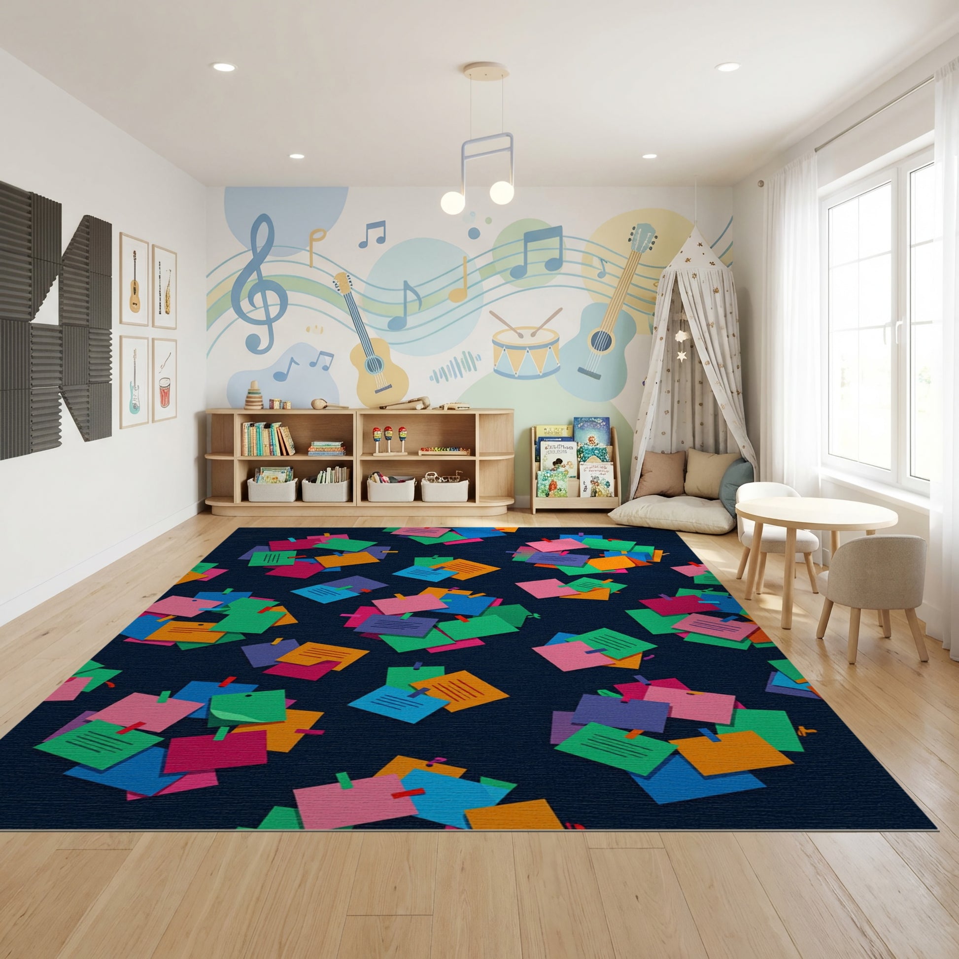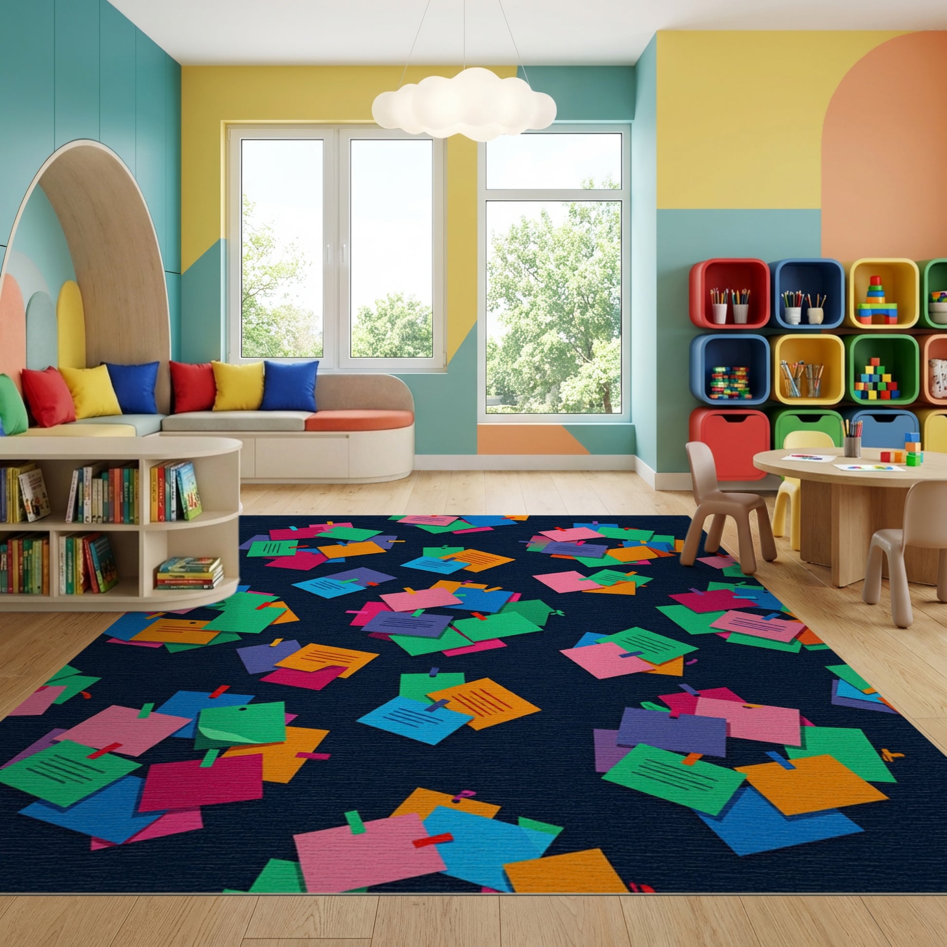 Flatwoven High Traffic Area Rug, Whimsical Multicolor Sticky Notes Navy Rug, Non Slip, Stain Resistant, Washable Area Rugs for Study Room, Playroom, Bedroom Overview: