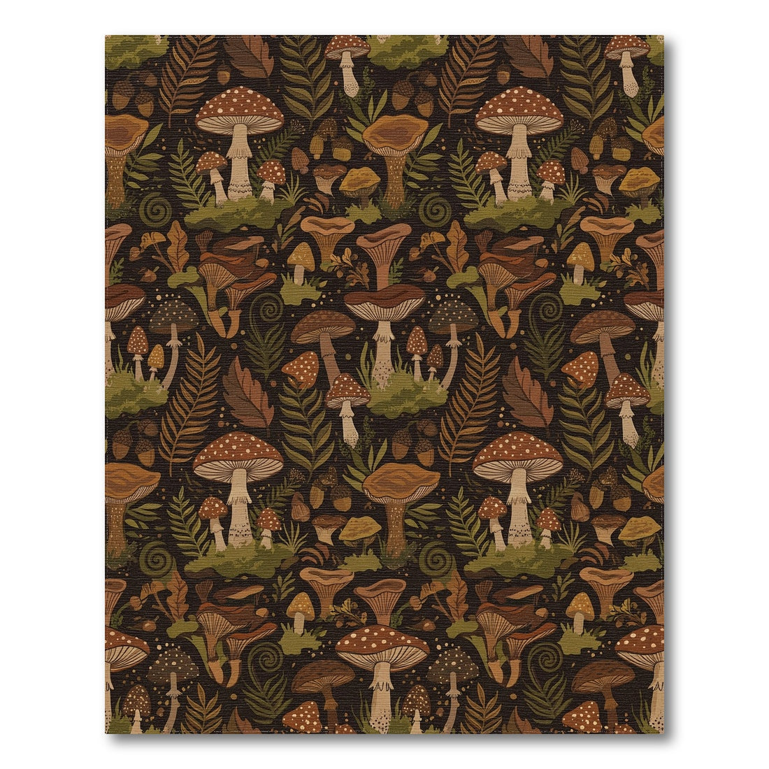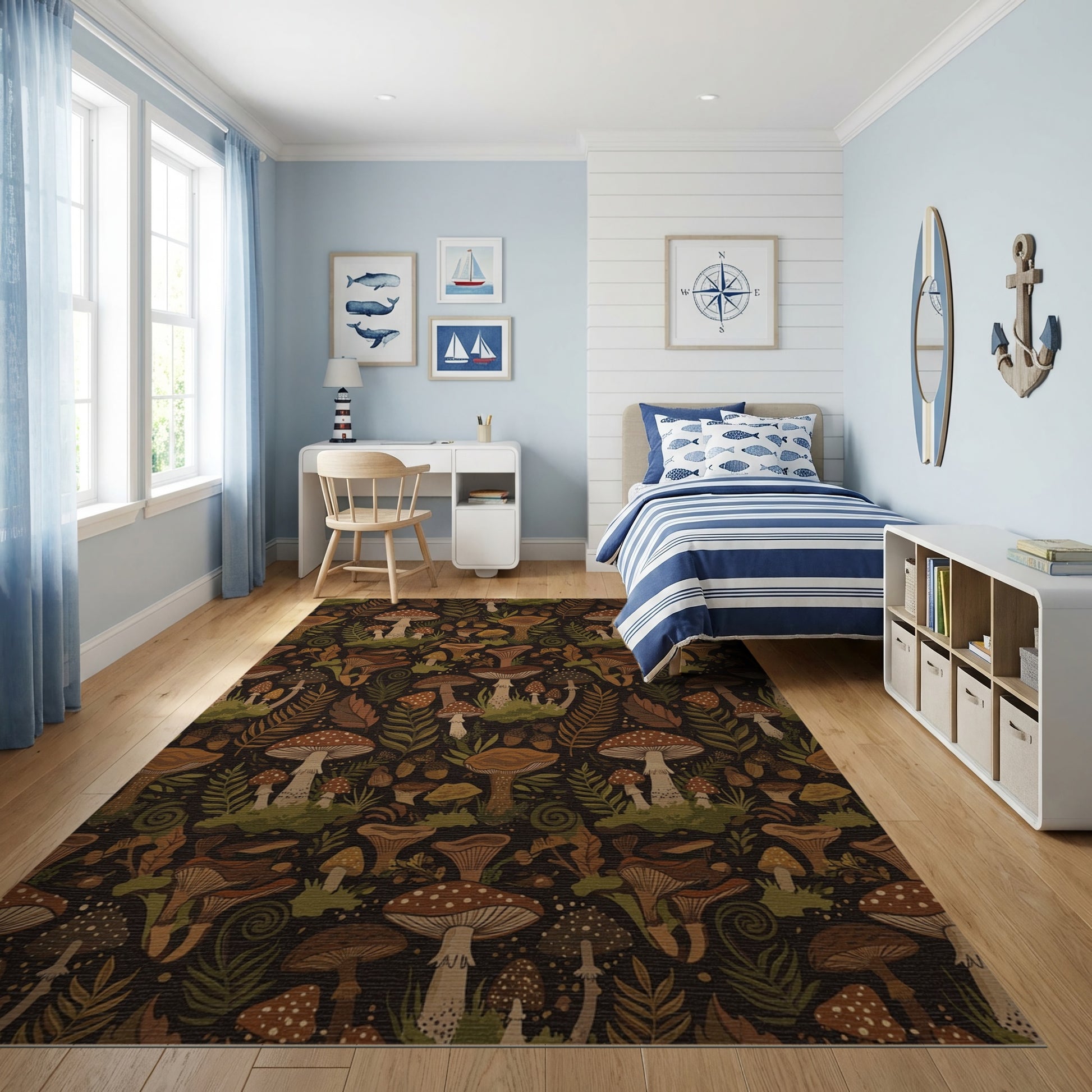 Flatwoven High Traffic Area Rug, Whimsical Mushroom Fern Acorn Forest Rug, Non Slip, Stain Resistant, Washable Area Rugs for Study Room, Playroom, Bedroom Overview: