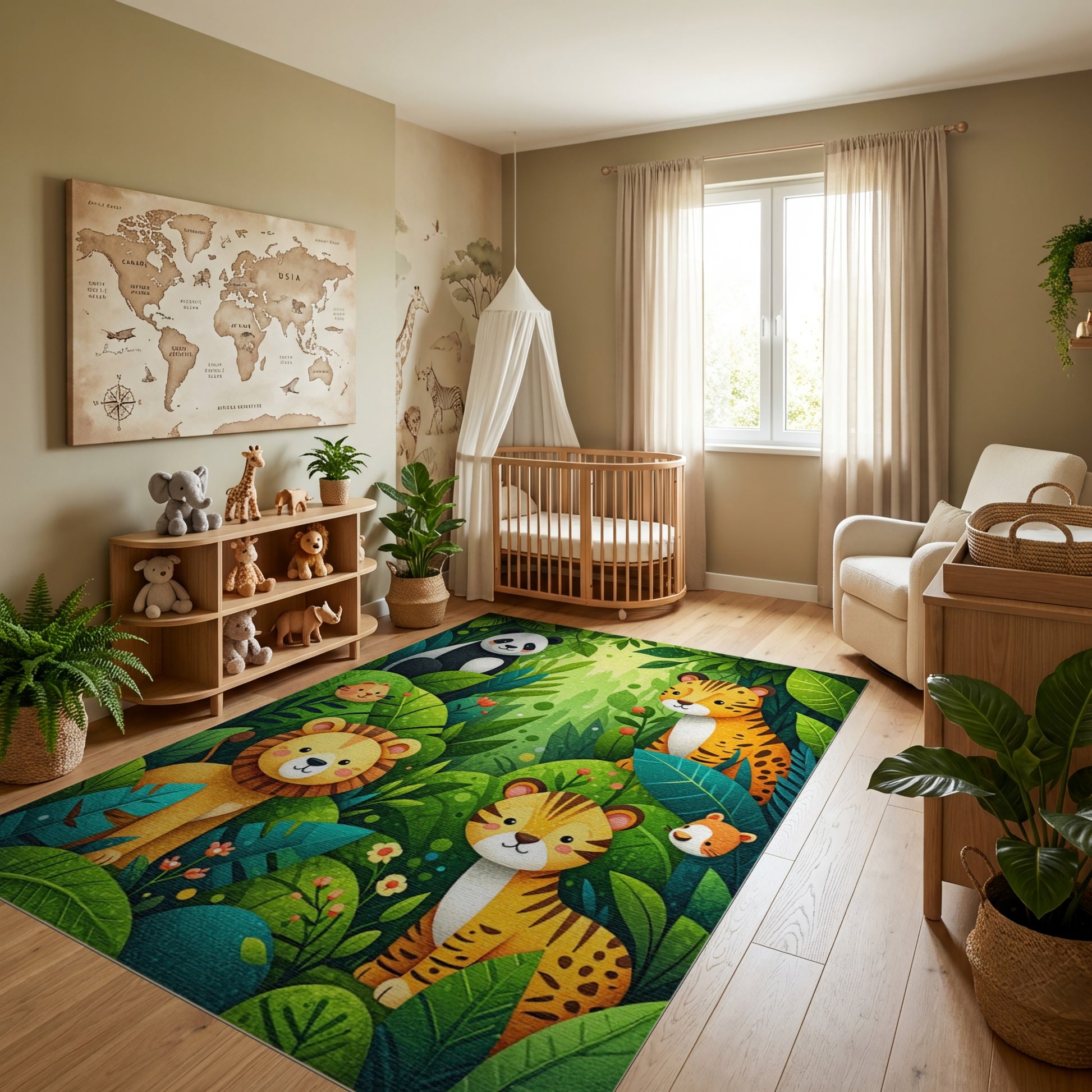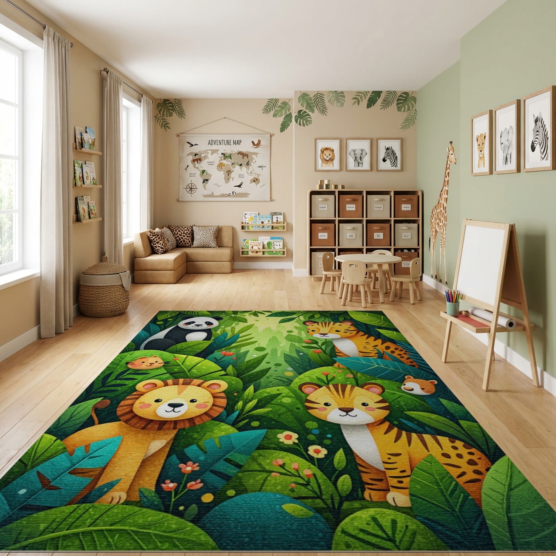 Flatwoven High Traffic Area Rug, Whimsical Panda Tiger Lion Jungle Rug, Non Slip, Stain Resistant, Washable Area Rugs for Study Room, Playroom, Bedroom Overview: