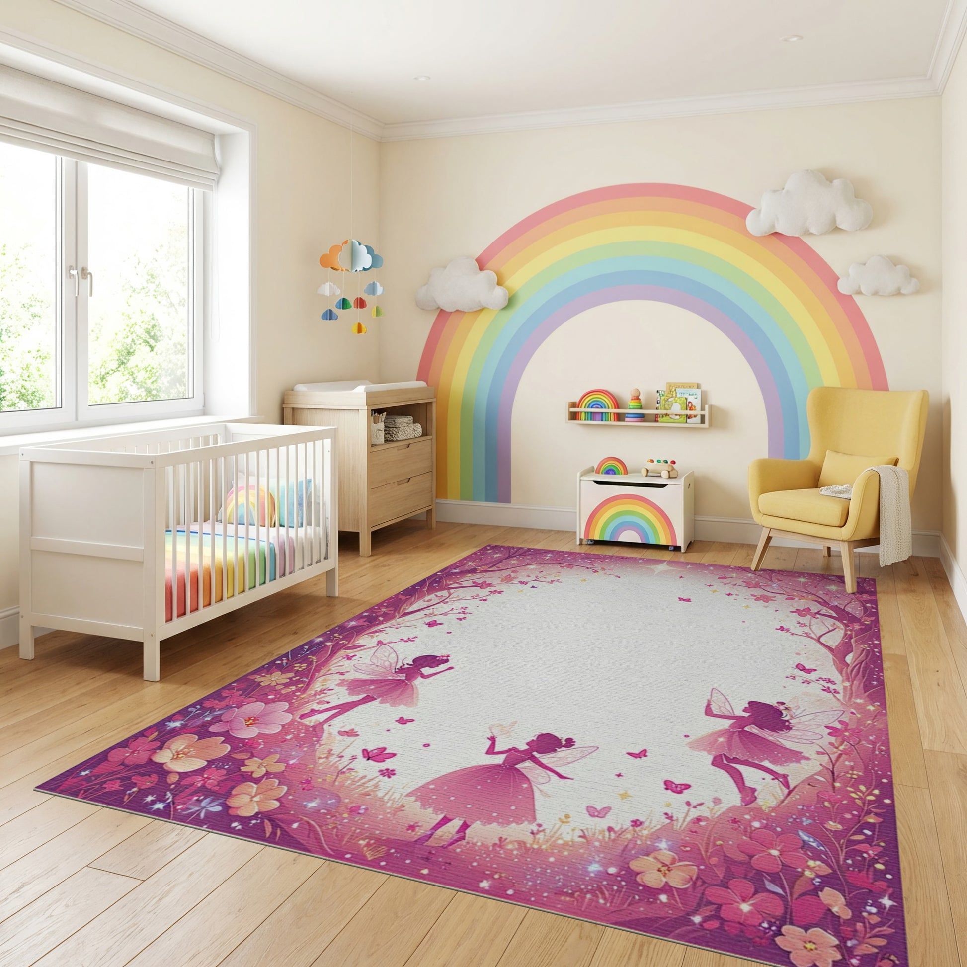 Flatwoven High Traffic Area Rug, Whimsical Pink Fairy Forest Sparkle Rug, Non Slip, Stain Resistant, Washable Area Rugs for Study Room, Playroom, Bedroom Overview: