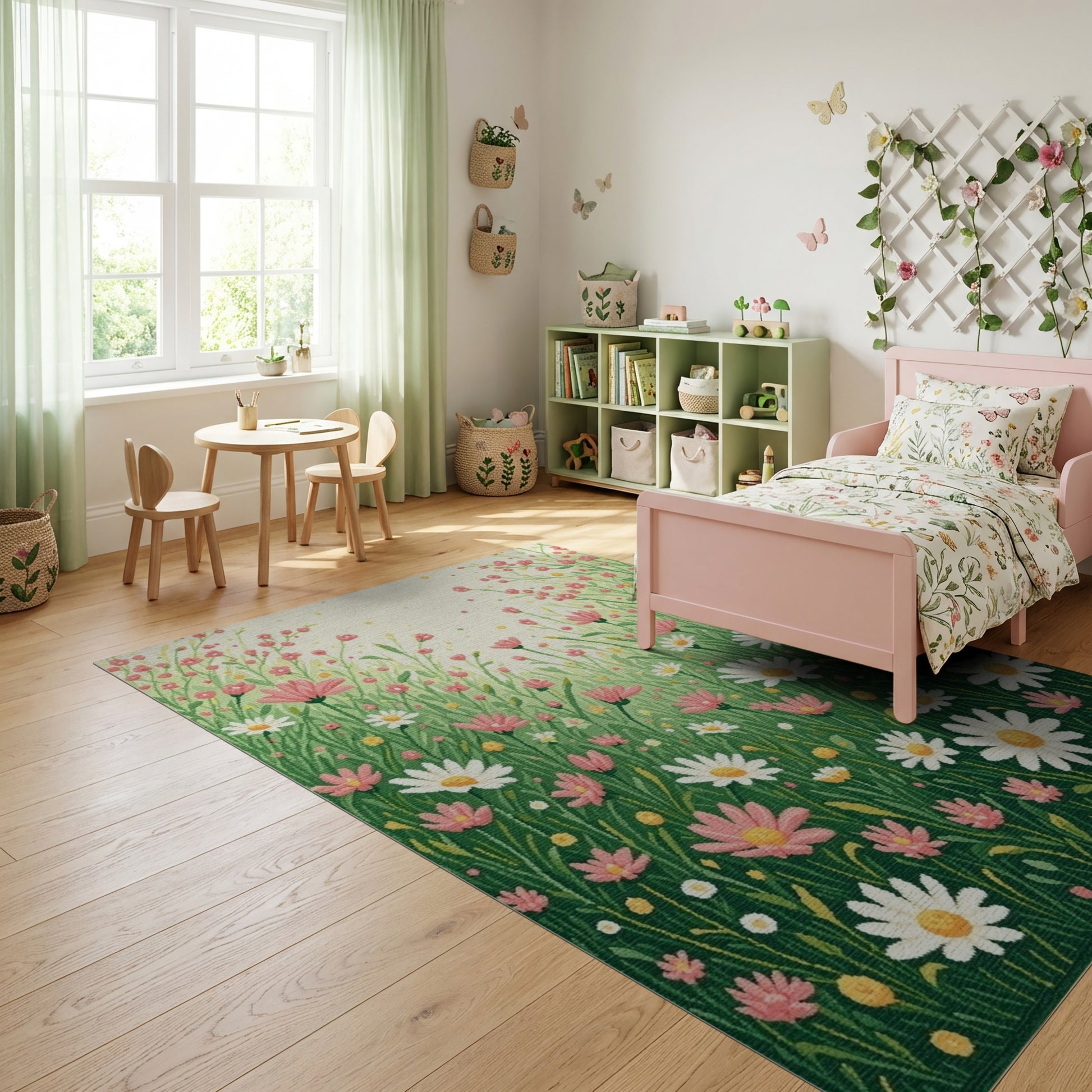 Flatwoven High Traffic Area Rug, Whimsical Pink Green Daisy Meadow Rug, Non Slip, Stain Resistant, Washable Area Rugs for Study Room, Playroom, Bedroom Overview:
