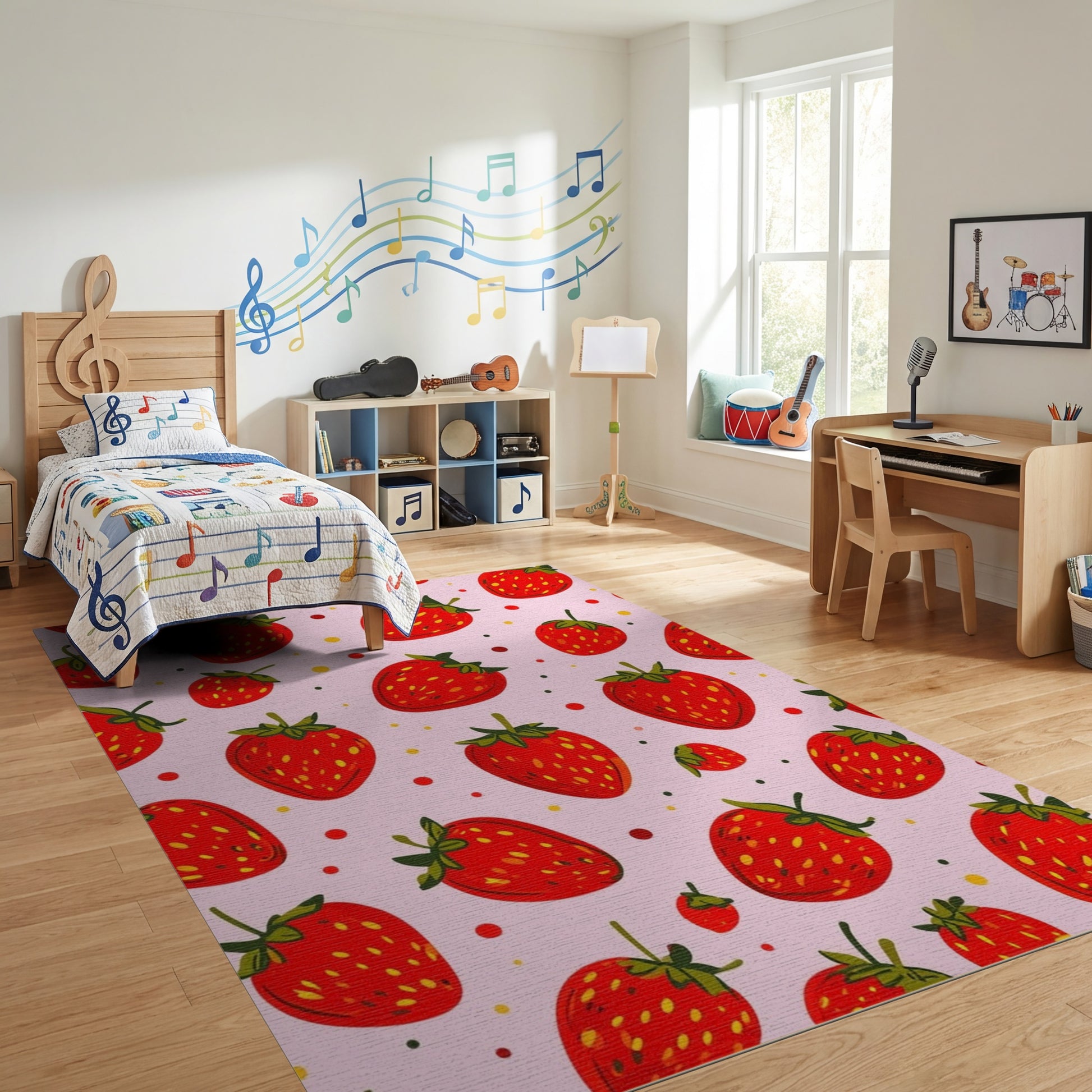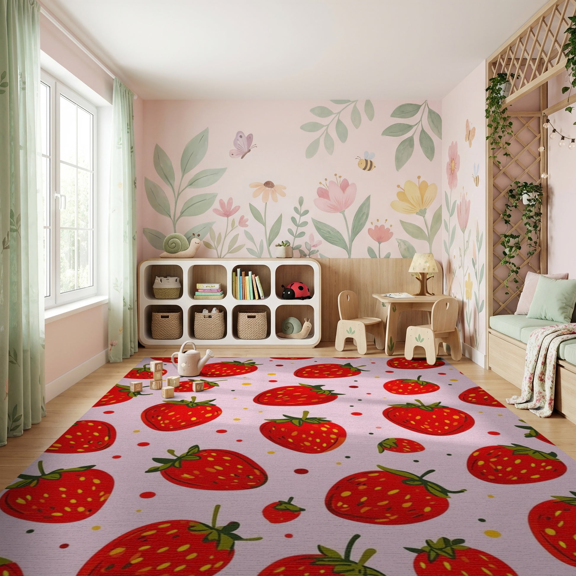 Flatwoven High Traffic Area Rug, Whimsical Pink Strawberry Yellow Dots Rug, Non Slip, Stain Resistant, Washable Area Rugs for Study Room, Playroom, Bedroom Overview: