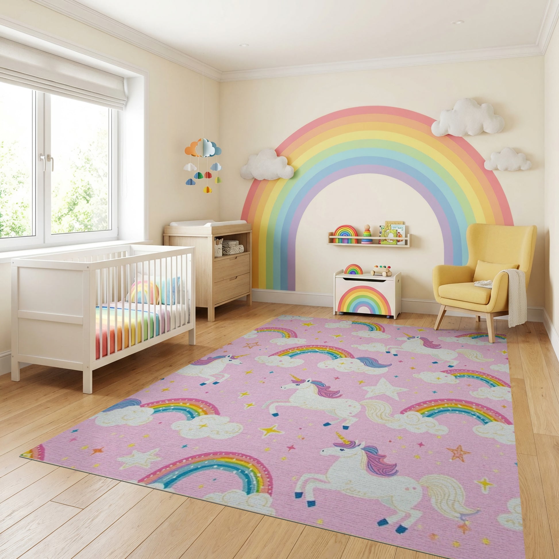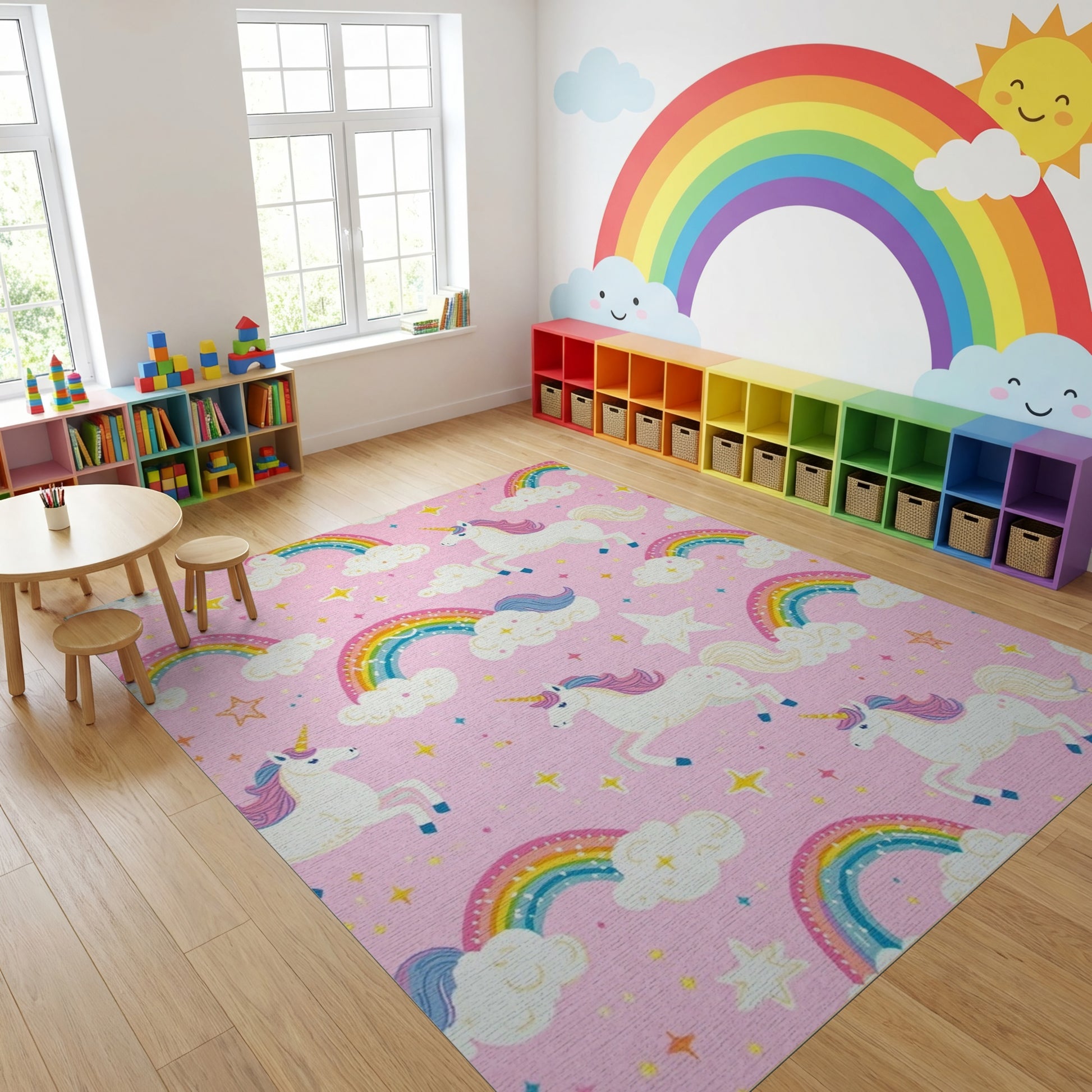 Flatwoven High Traffic Area Rug, Whimsical Pink Unicorn Rainbow Stars Rug, Non Slip, Stain Resistant, Washable Area Rugs for Study Room, Playroom, Bedroom Overview: