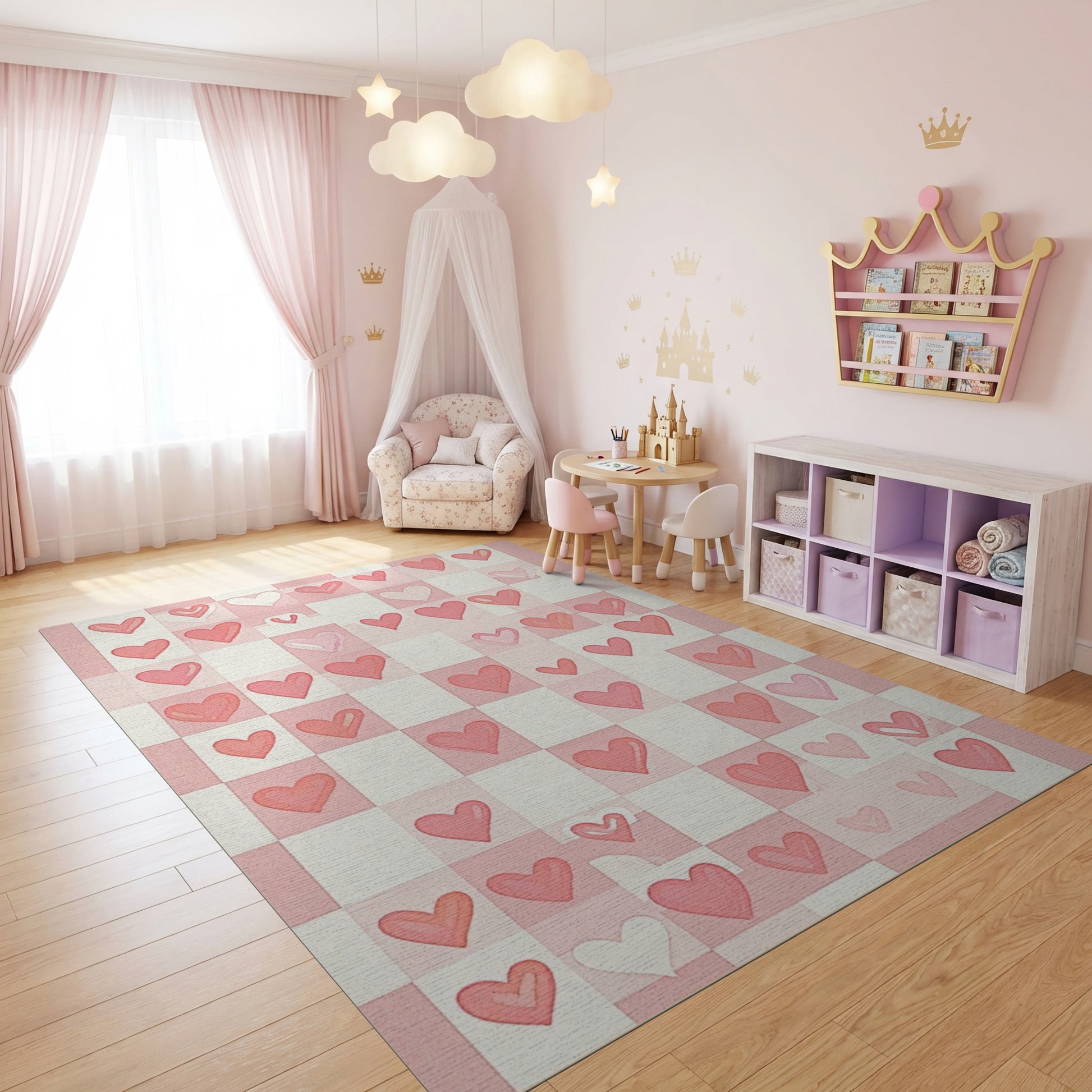 Flatwoven High Traffic Area Rug, Whimsical Pink White Checkered Hearts Rug, Non Slip, Stain Resistant, Washable Area Rugs for Study Room, Playroom, Bedroom Overview:
