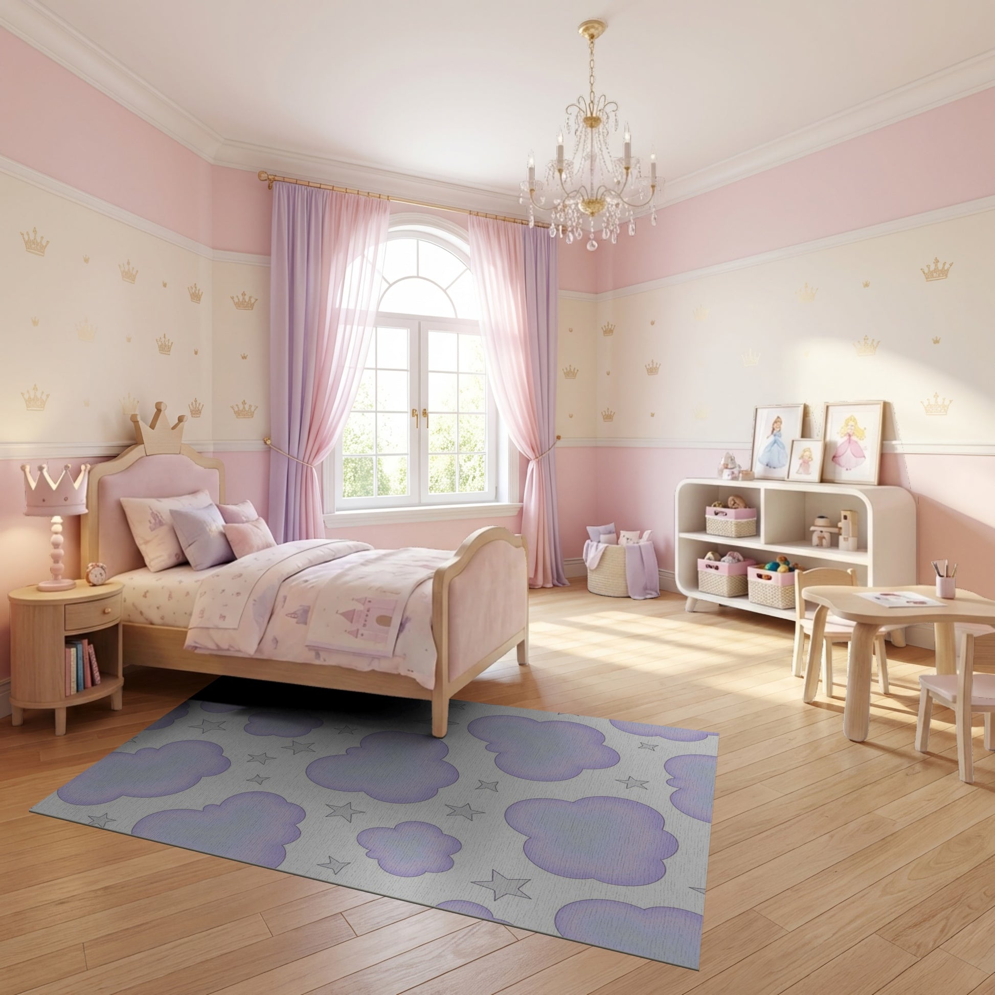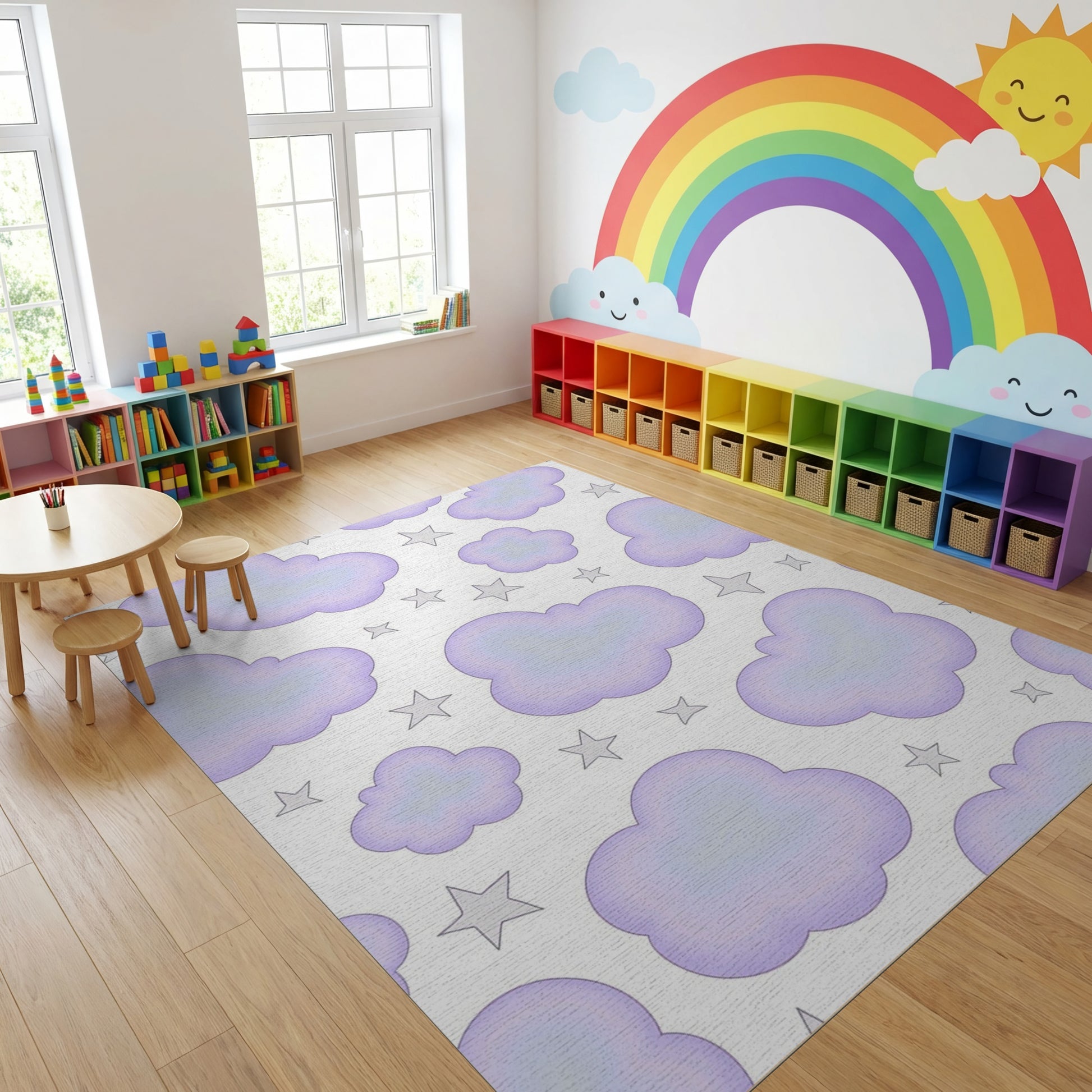 Flatwoven High Traffic Area Rug, Whimsical Purple Clouds Silver Stars Rug, Non Slip, Stain Resistant, Washable Area Rugs for Study Room, Playroom, Bedroom Overview: