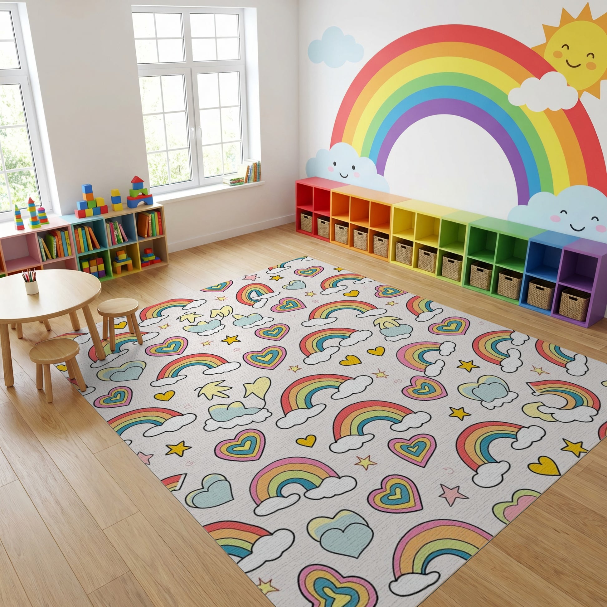 Flatwoven High Traffic Area Rug, Whimsical Rainbow Hearts Stars Clouds Rug, Non Slip, Stain Resistant, Washable Area Rugs for Study Room, Playroom, Bedroom Overview: