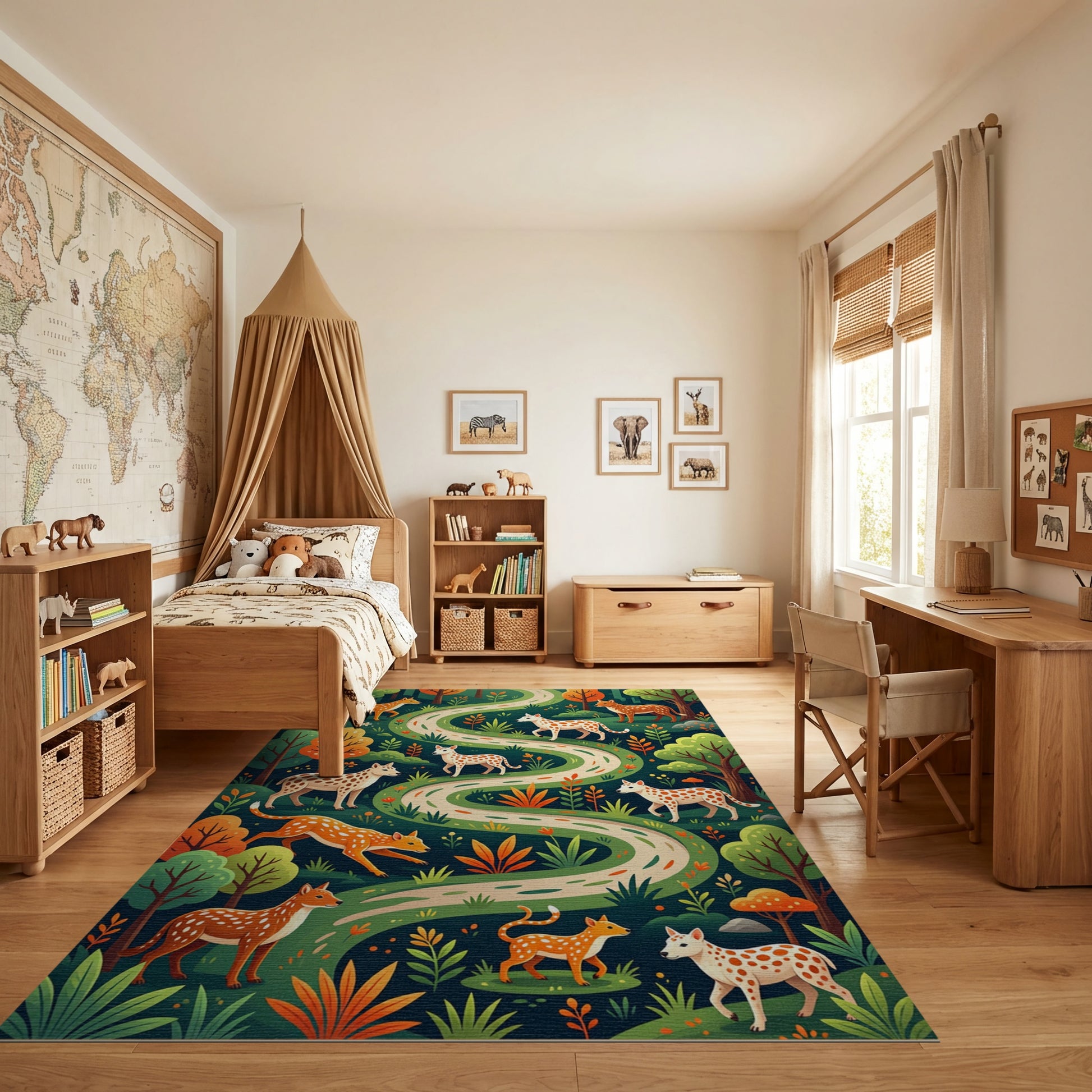 Flatwoven High Traffic Area Rug, Whimsical Spotted Deer Forest Path Rug, Non Slip, Stain Resistant, Washable Area Rugs for Study Room, Playroom, Bedroom Overview:
