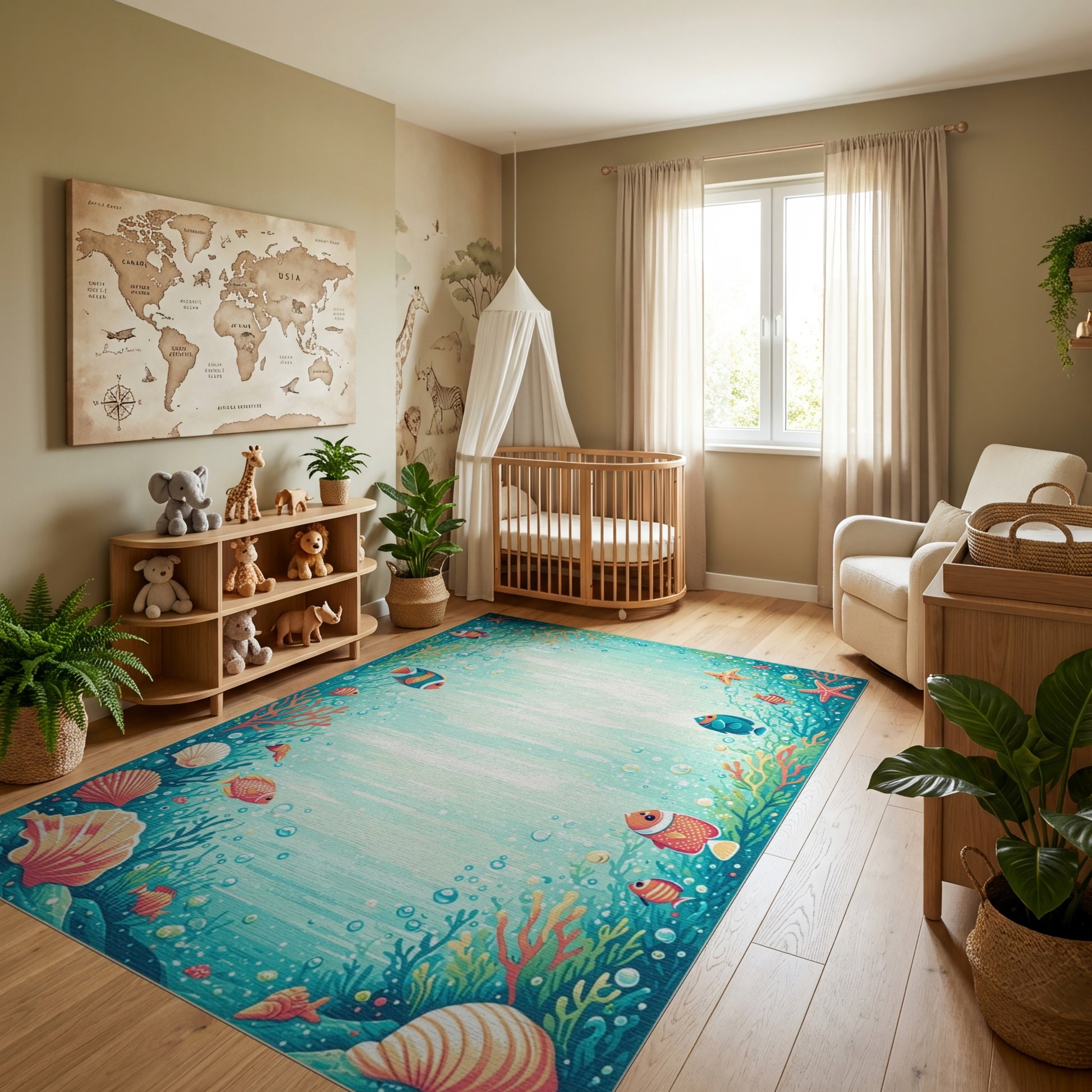 Flatwoven High Traffic Area Rug, Whimsical Teal Coral Fish Reef Rug, Non Slip, Stain Resistant, Washable Area Rugs for Study Room, Playroom, Bedroom Overview: