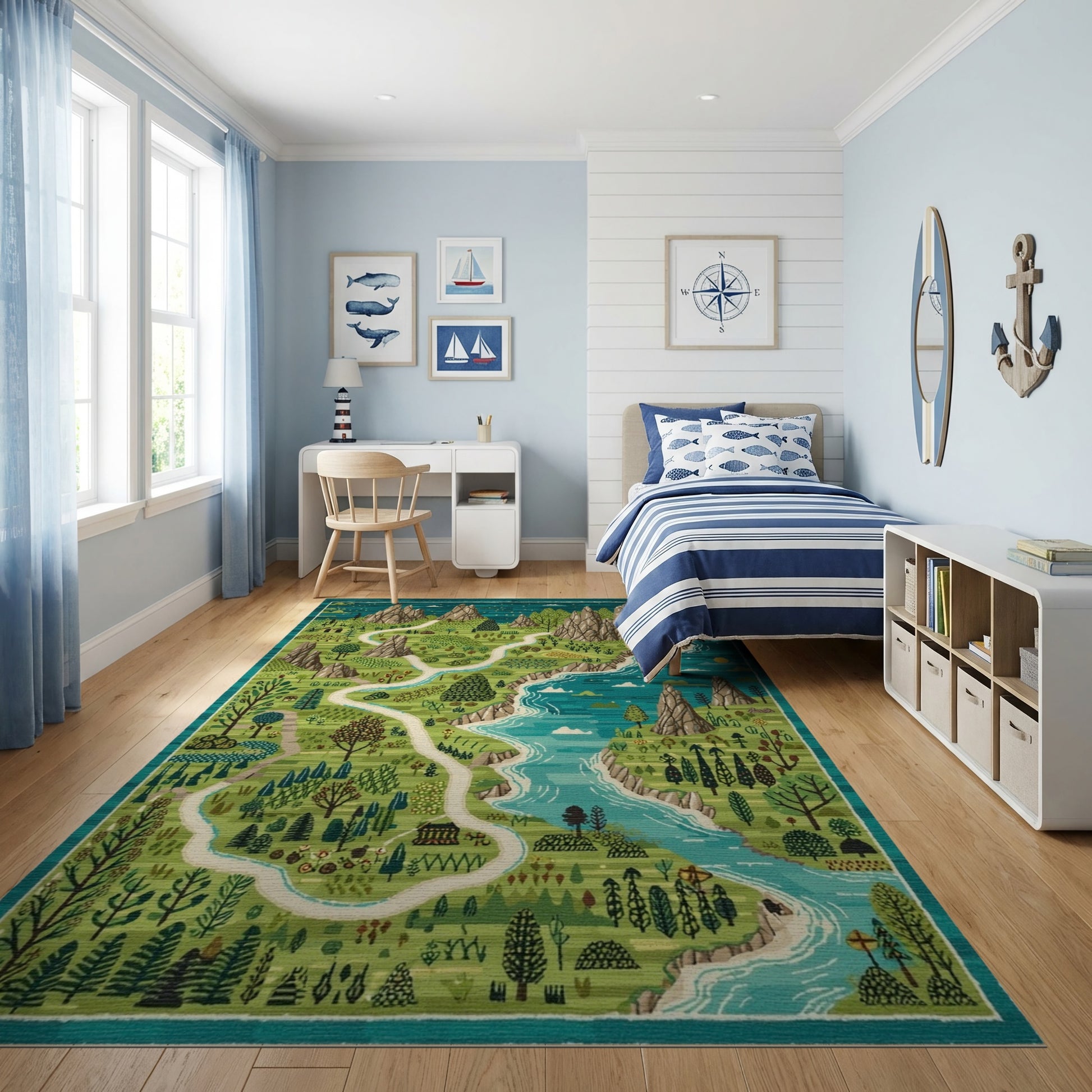 Flatwoven High Traffic Area Rug, Whimsical Teal Mountain River Forest Path Rug, Non Slip, Stain Resistant, Washable Area Rugs for Study Room, Playroom, Bedroom Overview: