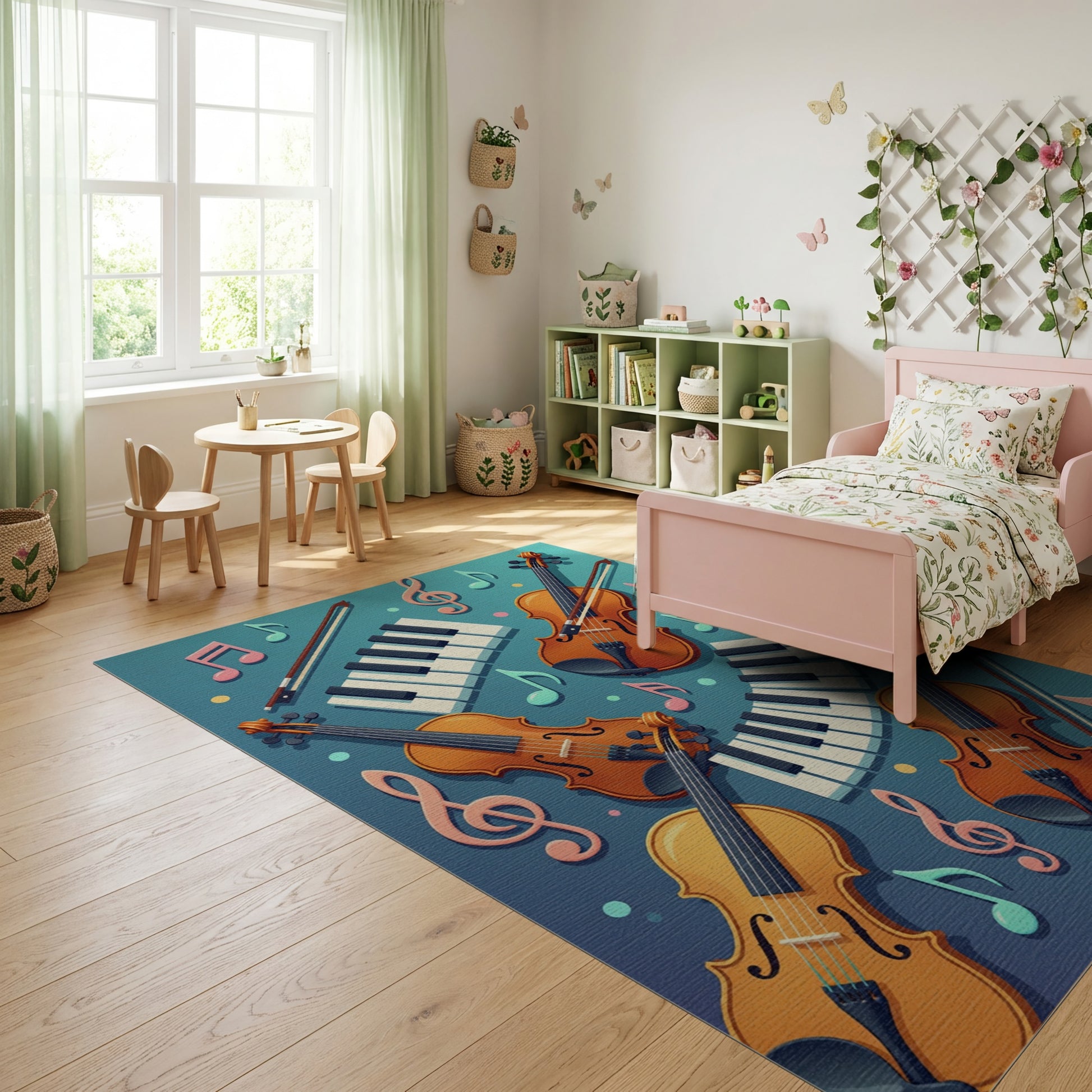 Flatwoven High Traffic Area Rug, Whimsical Violin Piano Notes Rug, Non Slip, Stain Resistant, Washable Area Rugs for Study Room, Playroom, Bedroom Overview: