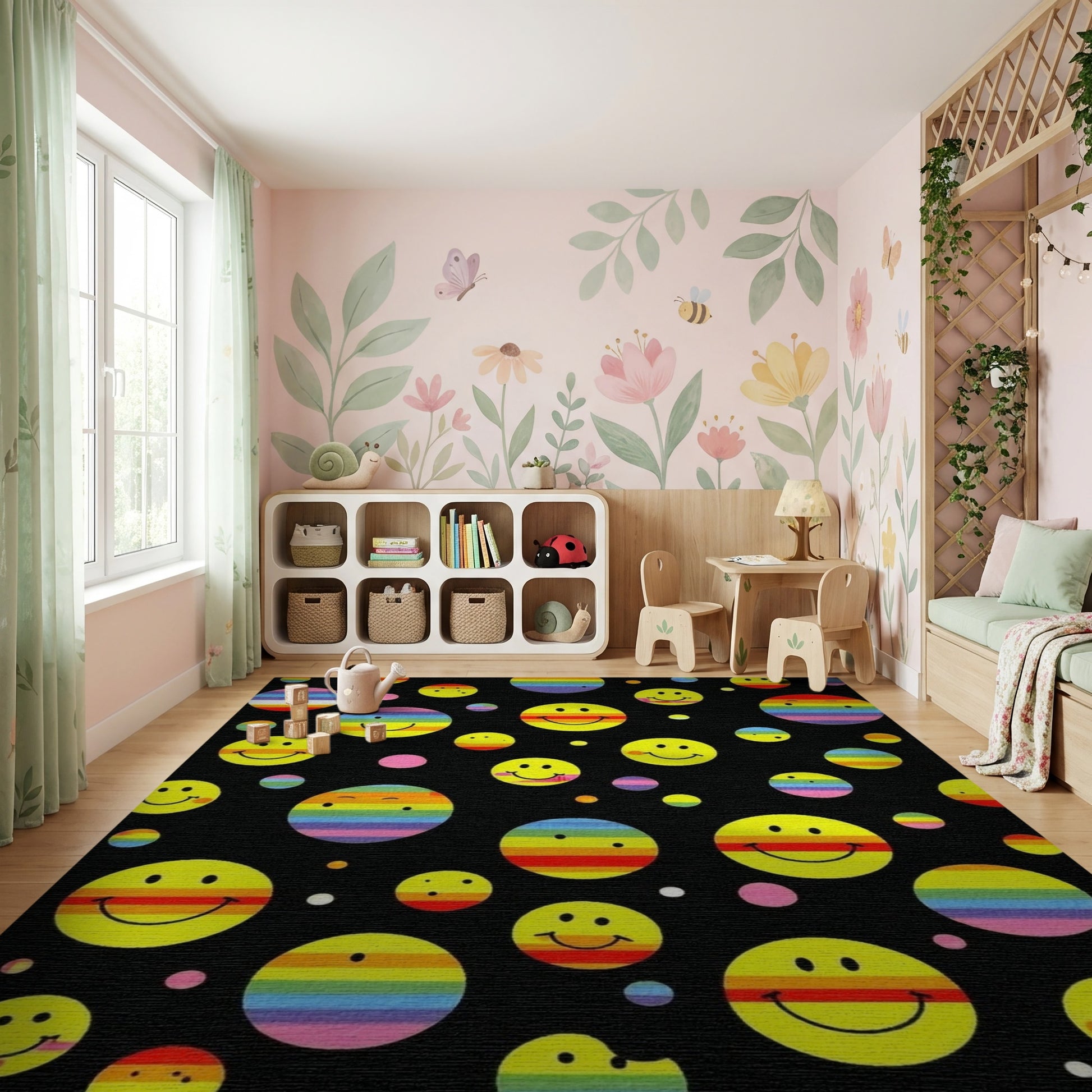Whimsical Yellow Smiley Rainbow Circles Rug