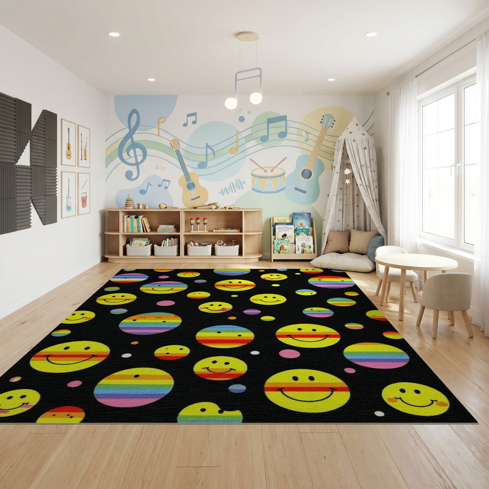 Flatwoven High Traffic Area Rug, Whimsical Yellow Smiley Rainbow Circles Rug, Non Slip, Stain Resistant, Washable Area Rugs for Study Room, Playroom, Bedroom Overview:
